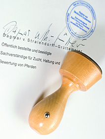 In der Pferdewelt gibt es eine Vielzahl selbsternannter „Experten“, „Gutachter“ oder „Sachverständiger“. Diese Bezeichnungen sind gesetzlich nicht geschützt, daher kann sich jeder so bezeichnen. Nur die behördlich geprüften „Öffentlich bestellten und vereidigten (oder beeidigten) Sachverständigen“ garantieren Unabhängigkeit, Vertrauenswürdigkeit und Sachkunde und nur diese dürfen den Rundstempel benutzen und werden ins Sachverständigenverzeichnis der Industrie- und Handelskammer (IHK) aufgenommen.